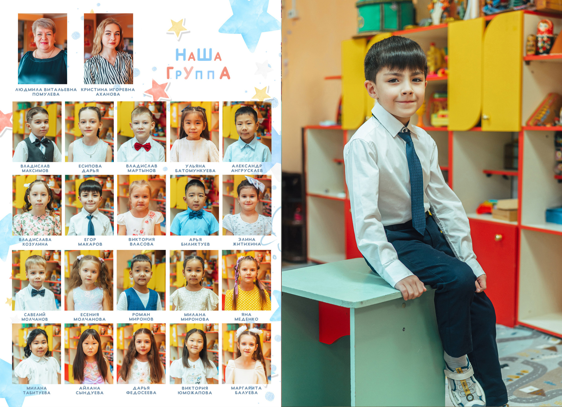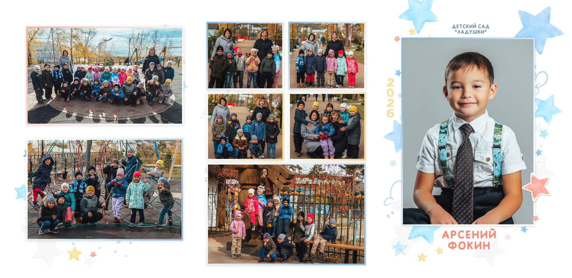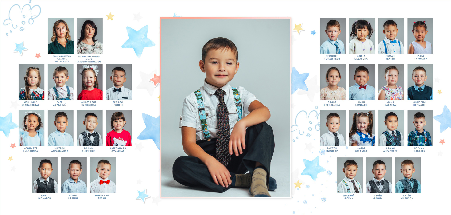 - Внутренний разворот: портрет выпускника и виньетка (портреты всех детей и воспитателя)
